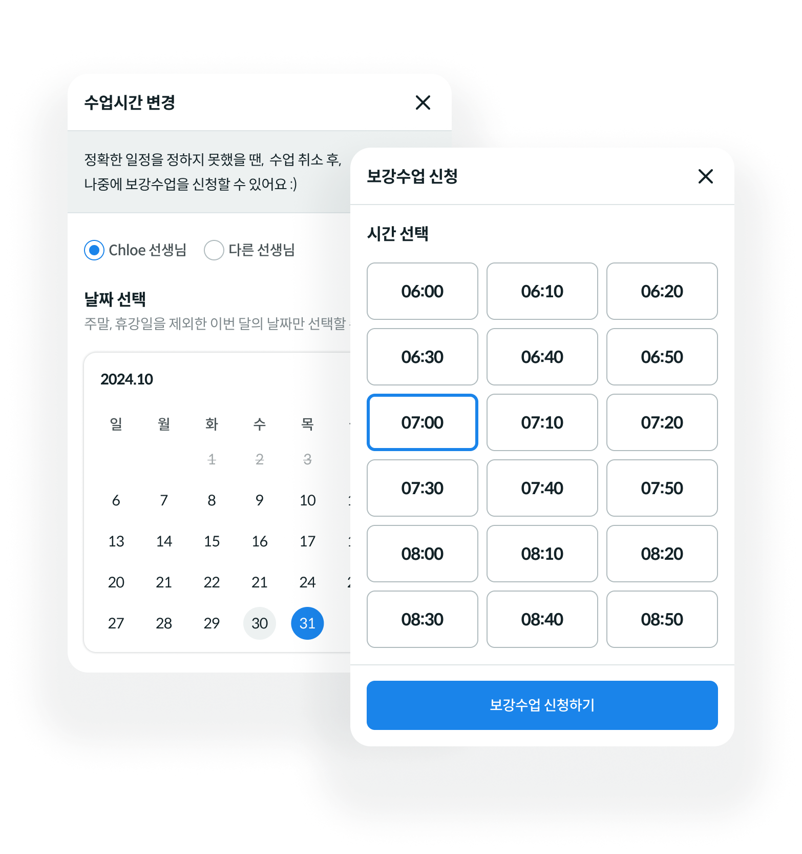 수업 시간을 변경하거나 수업을 취소해 보강수업을 신청할 수 있죠.